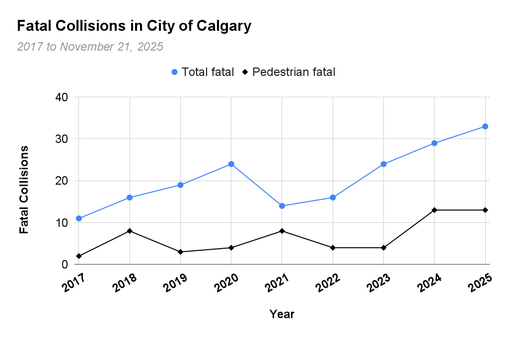Alarmingly, the number of fatal traffic collisions in Calgary continues to increase, including fatal collisions involving pedestrians. (Data source: City of Calgary)