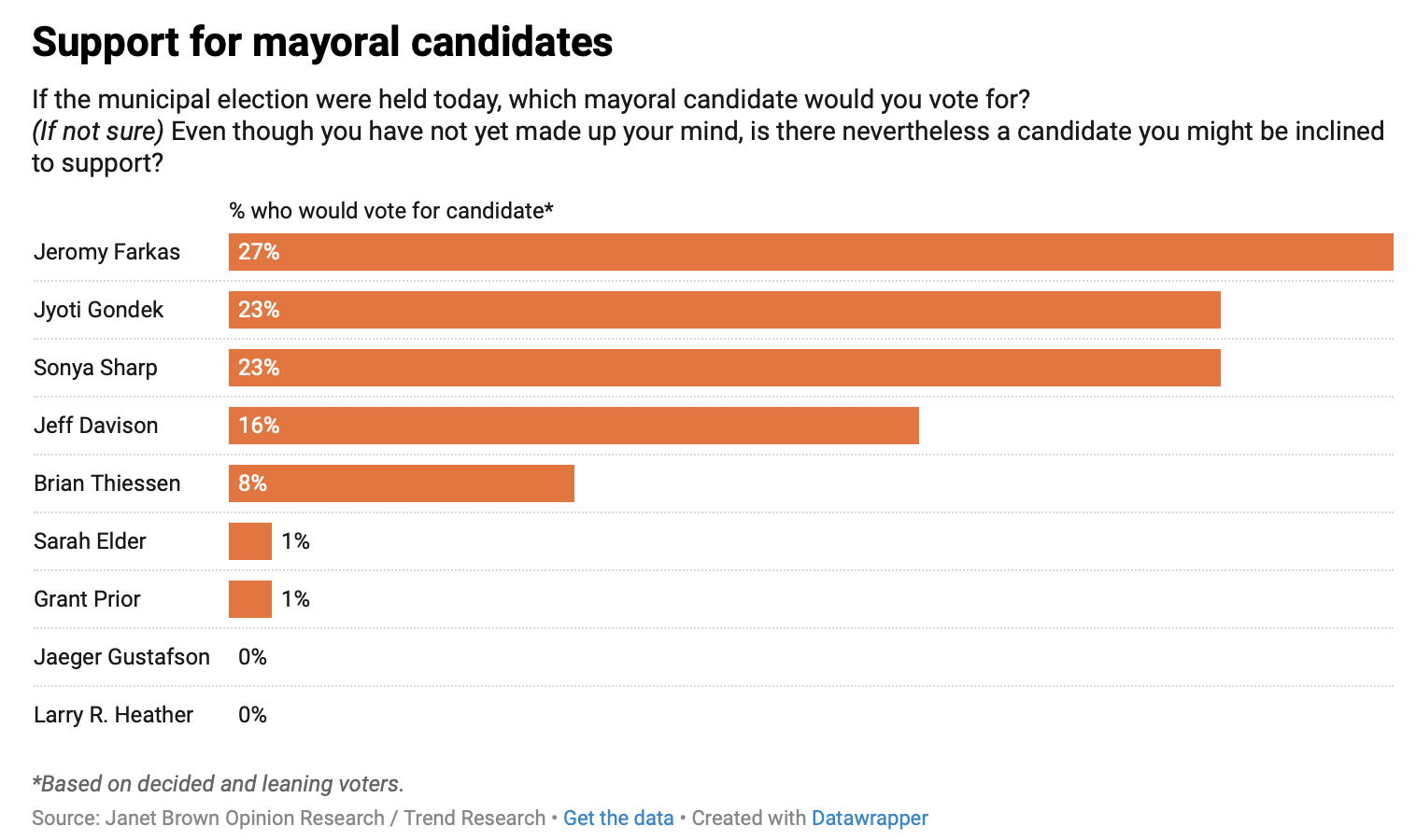 The latest Calgary mayoral poll conducted by Janet Brown Opinion Research indicates that Jeromy Farkas could be elected Calgary's next mayor on October 20th.