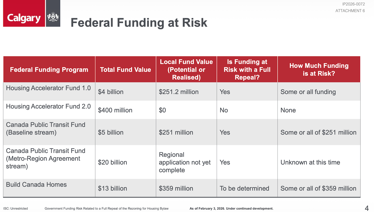 $861-million in federal funding will go up in smoke if Farkas repeals rezoning without replacing it with the gentle density that he promised. Source: City of Calgary (IP2026-0072 Attachment 6)
