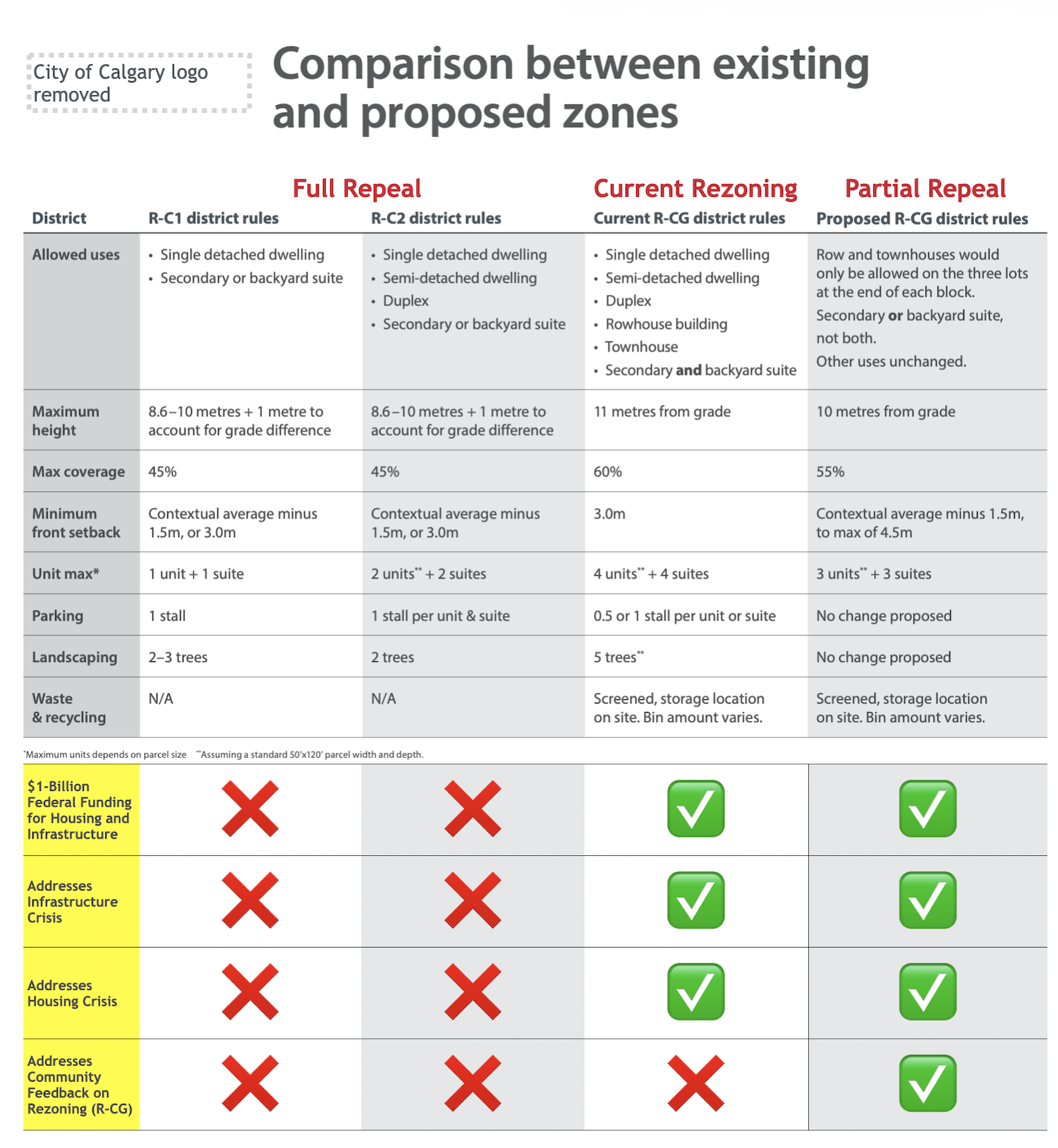 Markup of City of Calgary table comparing options for full repeal, no repeal, or partial repeal of rezoning. Yellow rows and red text added by Project Calgary. (Source table: City of Calgary)Â