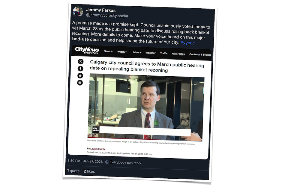Calgary Mayor Farkas celebrated “promise made is a promise kept” when he announced the March 23rd date for the public hearing on the proposal to repeal blanket rezoning, but he has thus far been quiet on his other campaign promise to replace rezoning with gentle density.